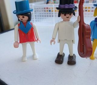 Lot de deux figurines Playmobil, l'une habillée en rouge avec un haut-de-forme bleu et l'autre en blanc avec un haut-de-forme noir et tenant un instrument de musique marron.