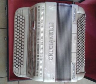 Accordéon chromatique CRUCIANELLI : diapason => 44 - teinte => nacré blanc ? 4 rangées ? 120 basses ? très peu servi - Poids 12.2 kg - valise de transport,