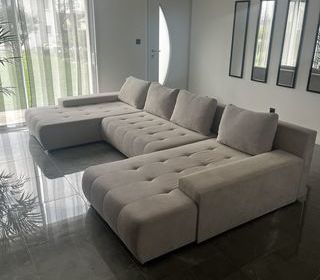 Je vends ce canapé panoramique en tissu beige il n'a que 1 ans. - Type de produit : Canapé panoramique - Matériau : Tissu - Couleur : Beige - Pièce : Salon Canapé toujours pro