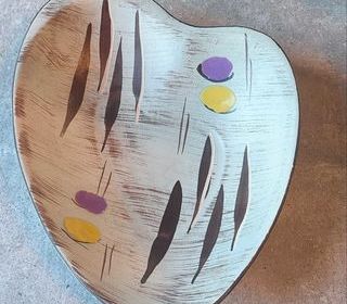 Plat en céramique marqué WEST-GERMANY numéroté 444 au design freeform typique des années 50/60. Sa forme organique , son décor abstrait et ses touches émaillées brillantes légèreme