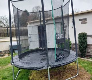 Trampoline 240-300 (diamètre 240 cm), de couleur noir, marque décathlon, ouverture sécurisé (pas de fermeture éclaire), avec échelle et encrages et bache, très peu servi (2 fois