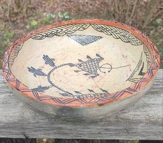 Ce+saladier+ancien+en+terre+cuite+berbère+est+une+pièce+façonnée+à +la+main+selon+la+technique+traditionnelle+du+colombin.+L'objet+présente+un+décor+intérieur+riche+en+symboles+pro