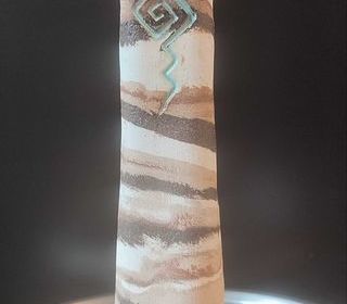 Vase cylindrique en grès tourné, travail artisanal des années 80. Décor de terres mêlées aux tons beige, ocre et brun, avec motif géométrique en léger relief. Intérieur et décor