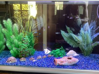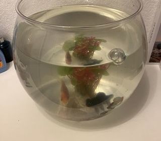 Bonjour bocal poisson en plastique + deux poissons Diamètre 33cm hauteur 28cm