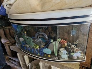 Vends aquarium panoramique 120 cm × 50 cm Environ 58 cm de hauteur 200 Litres Décors, sable , gravier ,2 pompes, bulleur, épuisette, nourriture, néon à changer. Petit aquar