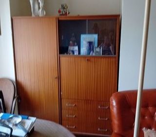 Meuble de bureau en bois simple ,mat non vernis, bois de couleur marron chocolat. Constitué d'une porte avec étagère ,d'une porte secrétaire, d'une vitrine et de deux tiroirs avec