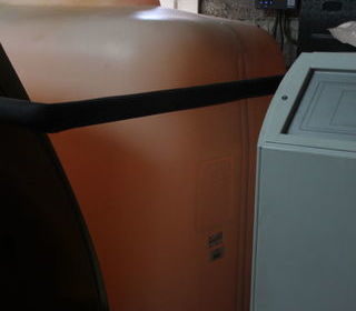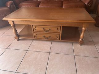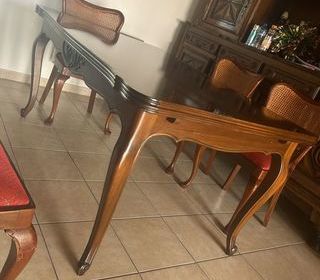 Table cuir 4 ou 6 chaises Recouverte de cuir Diamètre : 1.15 m Hauteur 64- 74 cm (épaisseur plateau) Rallonge : 40 cm * 2 Total : 2 m déplié Beaucoup plus conviviale