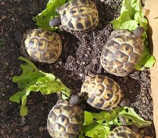 Tortues terrestres nées en 2024 et 2023- Elles sont nées dans mon jardin et ont hiberné tout l'hiver à l'extérieur. Prévoir un enclos grillagé sur le dessus. Pour plus d'informa
