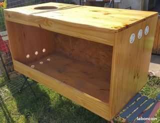 bonjour a vendre terrarium fabrication fait par un menuisier en véritable bois . 120x60x60 aération basse et haute , glace avec rail haut et bas pour facilitée le nettoyage .verni