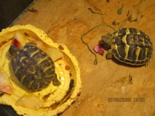 tortues de terres nées en juillet et aout 2025 . très vives et mangent de tout . en terrarium ou aquiarium avec lampe pour reptile . 80 euros pièce .