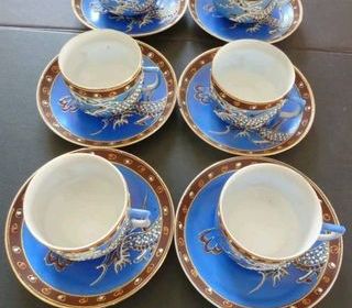 6 TASSES à CAFÉ et 6 SOUCOUPES en Porcelaine Fine. Production des Années 1945/50. Chaque Pièce est Siglée : TRADE ORIGINAL MARK avec Croissant et Etoile. Toutes Décorées