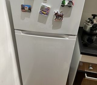 Réfrigérateur blanc avec congélateur en partie haute, porte équipée de plusieurs magnets décoratifs, de la marque Listo.