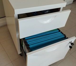 Caisson de bureau Ikea, blanc, à clés et à roulettes. Hauteur 56cm Largeur 41cm Profondeur 50cm 1 tiroir haut et 1 tiroir bas dossiers suspendus Le tiroir bas est peu renf