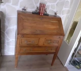 Bureau ne pente style louis XVI en noyer clair massif longueur 81 cm hauteur 100 cm profondeur 41 cm profondeur plateau ouvert 75 cm très bon état cuir neuf couleur fauve au