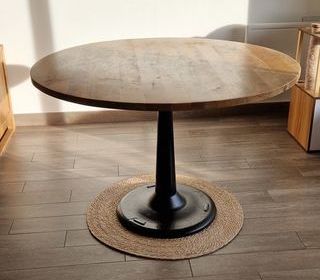 Diamètre 115cm, hauteur 78cm. Plateau en manguier. Pied central metal lourd. Modèle Factory de maison du monde. Style industriel.