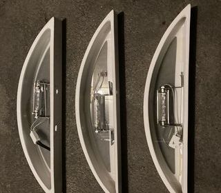 Meuble de marque Roche Bobois, composé de plusieurs éléments modulables. Ensemble comprenant une vitrine avec portes vitrées et étagères en verre, ainsi que des modules de rangeme
