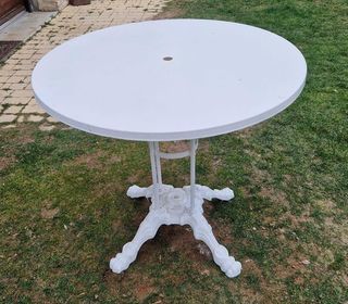 tres beau salon de jardin avec ses quatres chaises plus une table avec un piètement en tête de lion il est des années 50 entièrement décaper et traité contre la rouille va aussi bi