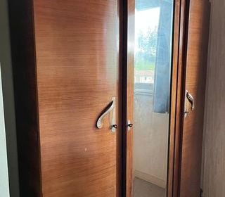 Armoire trois portes avec un grand miroir couleur chêne clair bois plaqué année 50 lit en 140x190 sans literie, table de nuit dessus marbre.