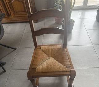 chaise haute d'enfant en bois, ancienne, pliable sur la hauteur et avec roulettes