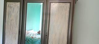 armoire 3 portes miroir lit en 140/190 en bois plaqué année 50 sans matelas ni sommier tapissier en bon état + table de nuit dessus marbre le tout en bon état