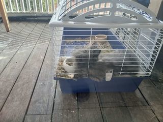 Lapin nain femelle, angora, 9 mois, blanche, noire et grise. Elle est câliné. Elle a besoin d'un brossage tous les jours avec une carde. Je vends le tout pour 30 euros : foin, cha