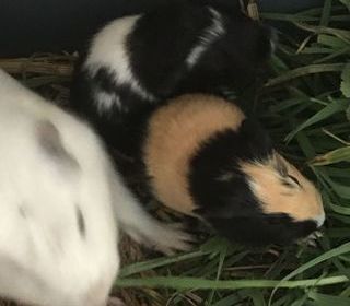 2 femelles cochons d'Inde Nées le 10 janvier Maman Cuy toute blanche Une noire et blanche avec rosace sur la tête Une beige et noire Habituées au contact humain, se laissent