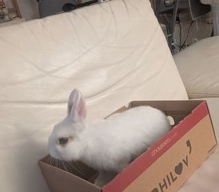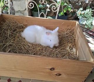 Lapin blanc avec quelques tâches beige aux yeux bleus