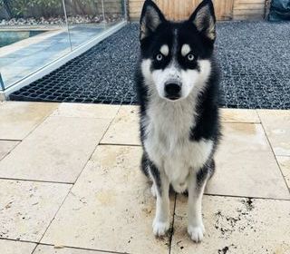 Pomsky d'élevage,agé de 1 an, Couleur noir et blanc, masque de lys, poil polaire, yeux bleus, il pèse actuellement 12.3 kilos, caractère joueur, affectueux, obéissant et en pleine