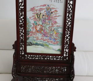 PLAQUE CHINOISE 8 PERSONNAGES Etiquette n° 731 Dimension avec cadre 39.6 cm x 56.2 cm Dimension du socle 16,5 x 46 cm Prix 2400 euros Etat de l'objet est visible