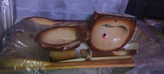 Ensemble de salle de bain comprenant une baignoire, un lavabo avec pied et un bidet, en céramique bicolore marron et beige. Les éléments semblent entreposés et non installés.