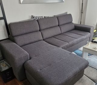 Canapé d'angle en tissu gris avec méridienne à gauche. Doté de plusieurs coussins pour un confort optimal. Structure résistante et tissu de qualité. Idéal pour aménager un salon.