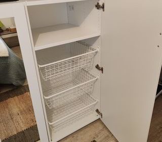 Armoire blanche avec une porte et trois paniers de rangement en métal à l'intérieur, ainsi qu'une étagère fixe. L'ensemble est en bon état et convient pour le rangement dans une ch