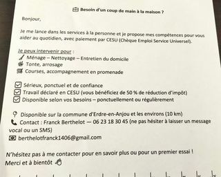 Bonjour, Je me lance dans les services à la personne et je propose mes compétences pour vous aider au quotidien, avec paiement par CESU (Chèque Emploi Service Universel). Je