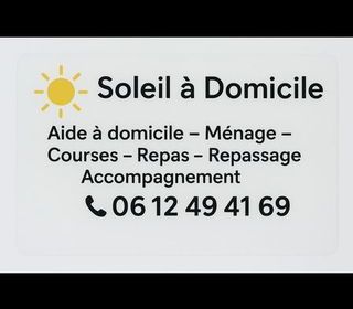 ? Aide ménagère à domicile ? Soleil à Domicile Je propose mes services pour vous aider dans votre quotidien : ménage, repassage, courses, préparation de repas, assistance aux pe