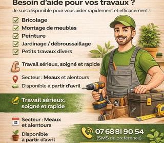 Bonjour, Pour tous vos petits travaux (jardinage, montage de meubles, peinture ou autres), n'hésitez pas à me contacter par sms Jeune et dynamique j'aime énormément faire du br