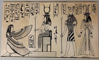 Panneau en érable gravé d'une scène hiéroglyphique. Gravé au laser et peint à la main. Dimensions: 30x18 cm