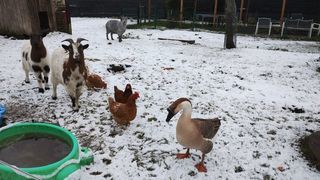 Jar mâle de l oie élevé avec poule et chèvre sympathique avec les humains