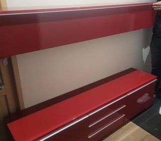 Meuble TV IKEA en laque rouge brillante, modèle 180 cm. Avec 3 tiroirs centraux + 2 grands rangements latéraux et le meuble de rangement haut. Finition brillante, poignées alumin
