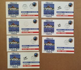 Lot de 7 cartes timbres oblitérés coupe du monde de football 1998 France - Marseille - Stade Vélodrome