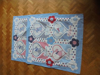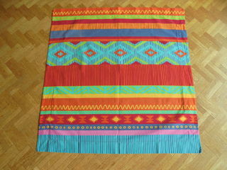Parure aux jolis motifs géométiques multicolores sur fond bleu, pour 2 personnes, composé de : - 1 drap plat 280 cm x 240 cm, - 2 taies oreiller. Excellent état. Récupéra