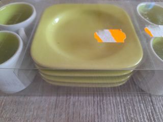 Ensemle composé de : - 4 petites tasses à café, - 4 soucoupes. Les tasses sont vert anis à l'intérieur et blanches à l'extérieur. Les soucoupes sont vert anis. Excellent é