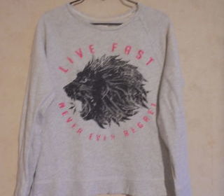 Sweat shirt, de la marque originale UNDIZ, col rond, manches longues, de couleur gris clair, impressions roses sur le devant "Live fast never ever regnet" + motif tête de li