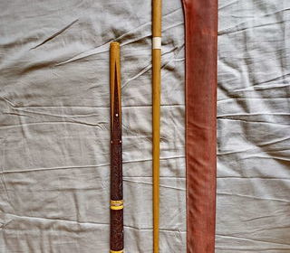 Queue de billard tournée en bois clair démontable, un fût sculpté de motifs floraux en bois sombre et des incrustations de nacre blanche et grise. Elle porte deux inscriptions grav