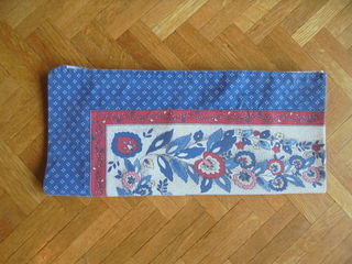 Parure pour 2 personnes, dans les tons de bleu et de bordeaux, composée de : - 1 drap plat 280 cm x 240 cm, - 2 taies d'oreiller, - 1 drap housse bordeaux. Excellent état.
