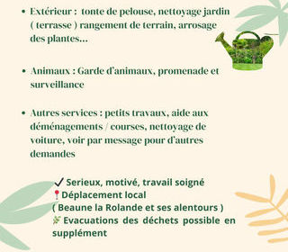 Je vous propose mes services pour vous soulager dans de nombreux domaines : - Entretien jardins : débroussaillage, tonte, taille... - Nettoyage de terrasse (haute pression) - A