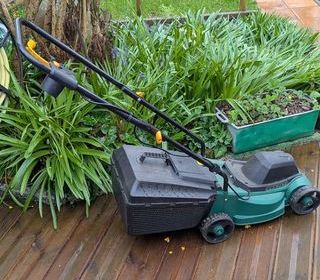 Tondeuse électrique avec bac de ramassage Légère - Maniement facile Pas de rallonge électrique fournie Très peu servie (environ 4 à 5 fois) - Bon état A prendre sur place Pri