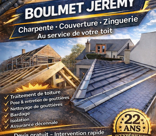 L'entreprise Boulmet Jérémy est spécialisée dans les travaux de charpente, couverture et rénovation de toiture. Basée sur le savoir-faire artisanal et le travail soigné, l'entrepri