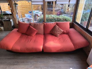 Canapé avec assise et dossier recouverts d?un tissu rouge orangé, accompagné de plusieurs coussins assortis. Modèle bas avec assises larges, visible en intérieur. Structure en bois