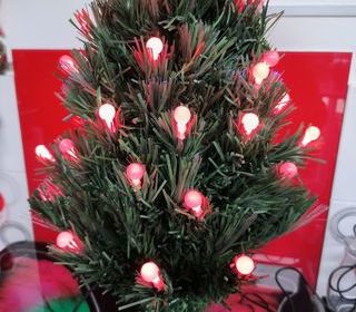 vends Sapin de NOEL fibres optiques poussoir pour couleur bleu/vert illuminé petites boules rouges fonctionne sur secteur 220v avec son adaptateur hauteur 55cm