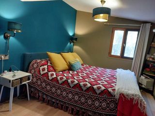 chalet complément rénové, 3 pièces (2 chambres avec dressing, séjour avec canapé d' angle, fauteuil, table de salle à manger et chaises), cuisine équipée, frigo américain, salle d